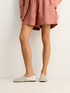 يُعتبر حذاء اللوفر هذا نسخة جديدة عصرية عن تصاميم المدينة المعهودة وهو مصنوع من جلد شيفرو وقد صُمم بتصميم مريح وكعب مطاطي ومقدمة منسوجة. يمكن انتعاله كقطعة مريحة بديلة عن الصنادل خلال الإطلالات الصيفية.