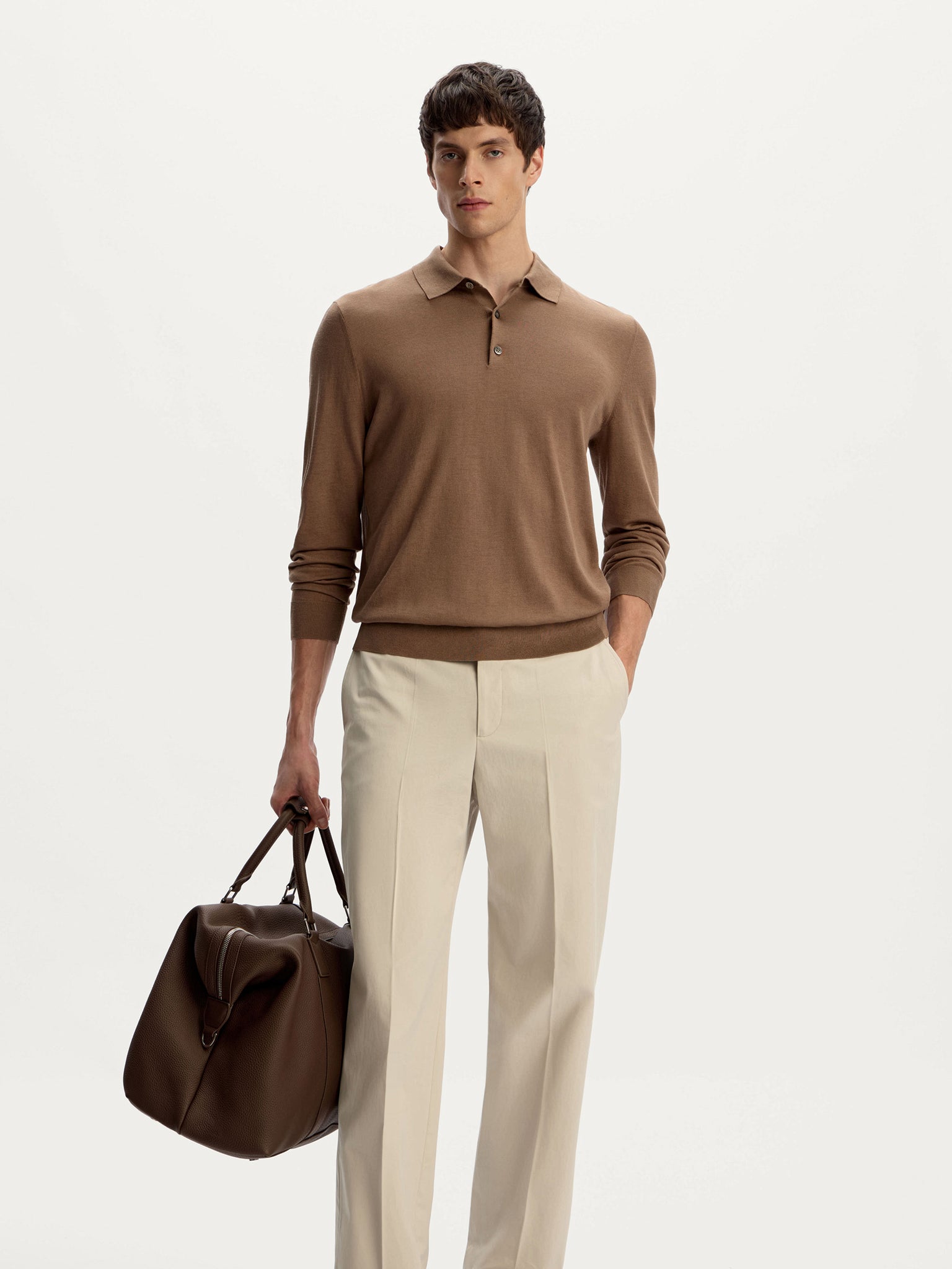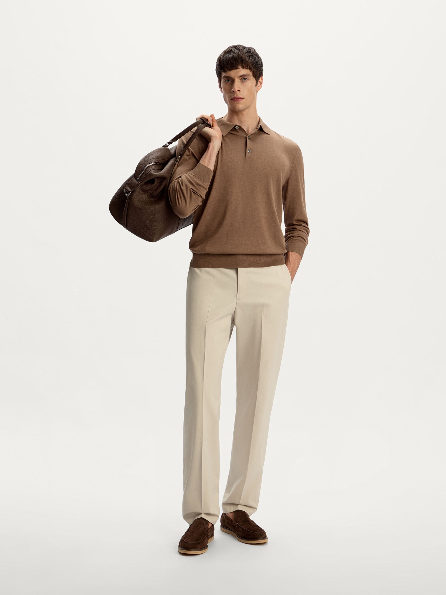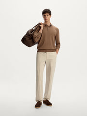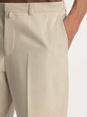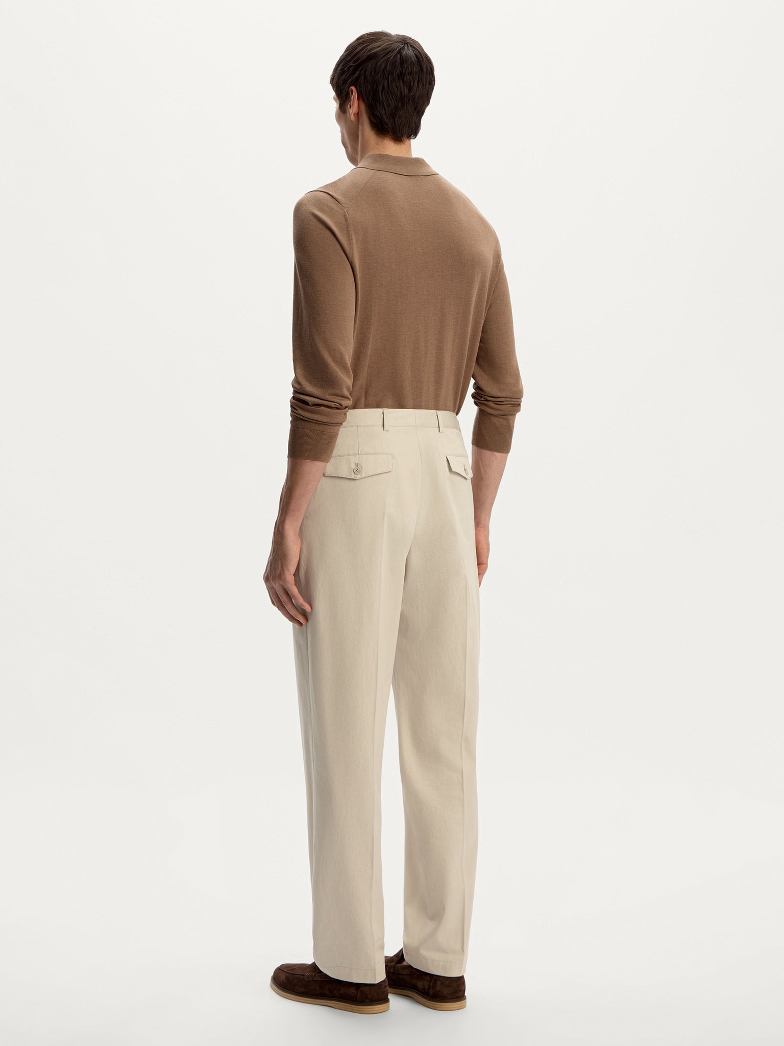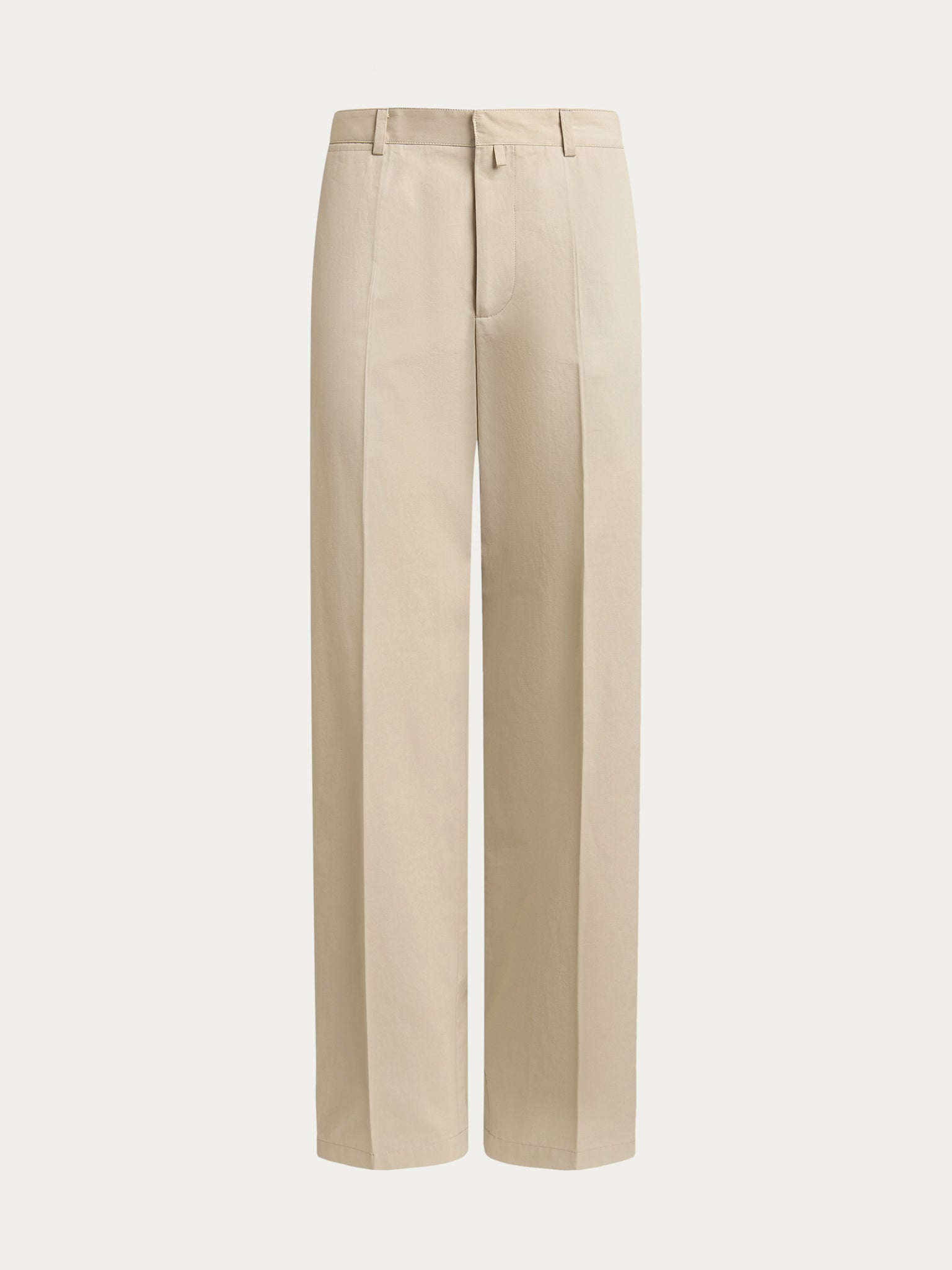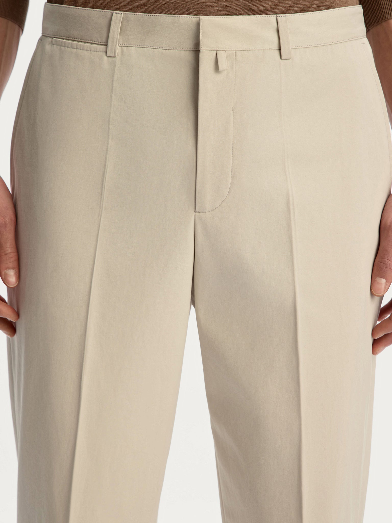 Classic chinos with pressed creases, featuring a straight-leg silhouette that tapers slightly toward the ankle. Crafted from Italian cotton with a hint of satin lustre, they bring a polished finish to casual looks.