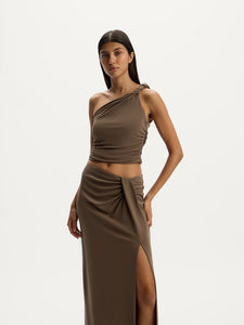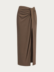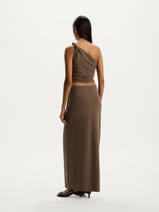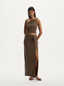 A statement piece for summer outings, this draped crepe skirt features an asymmetric knot at the waist for a defined shape. The waistband is elasticated for a flexible fit, while the high slit allows for ease of movement. Crafted from textured crepe with a structured yet fluid feel. Complete the set with the matching 12 STOREEZ top.
