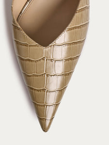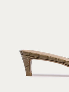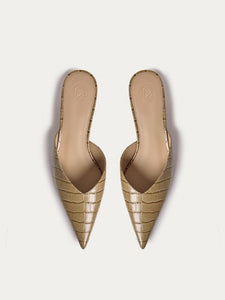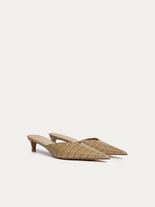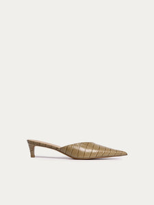 A pair with a laid-back attitude, these mules are crafted from crocodile-embossed leather in a sleek V-cut that gently hugs your feet. Lined with supple chevreau leather, they feature durable microfibre insoles and slip-resistant soles. The reinforced toe doesn't crease, while the versatile shade easily transitions from day to night.