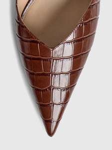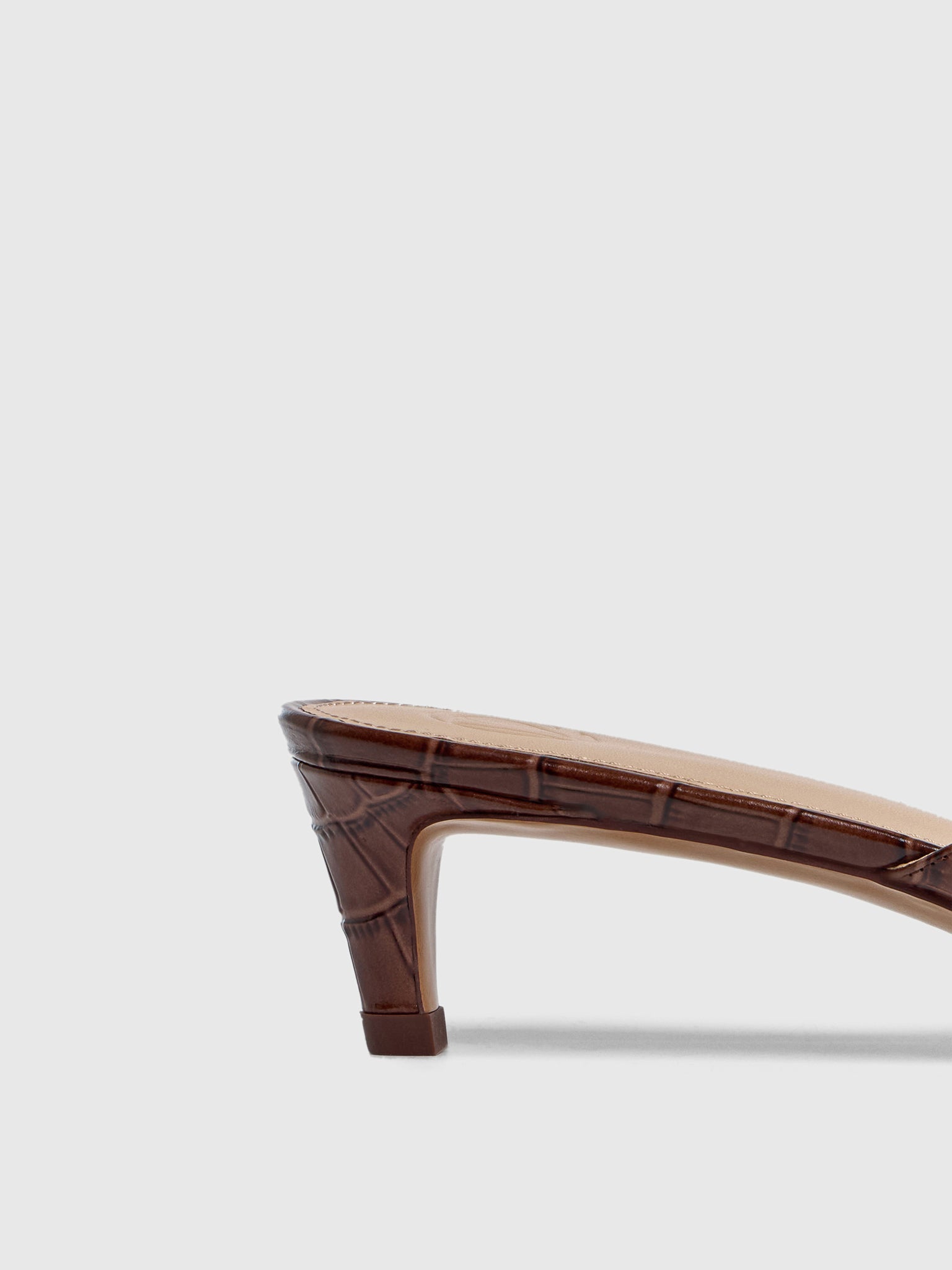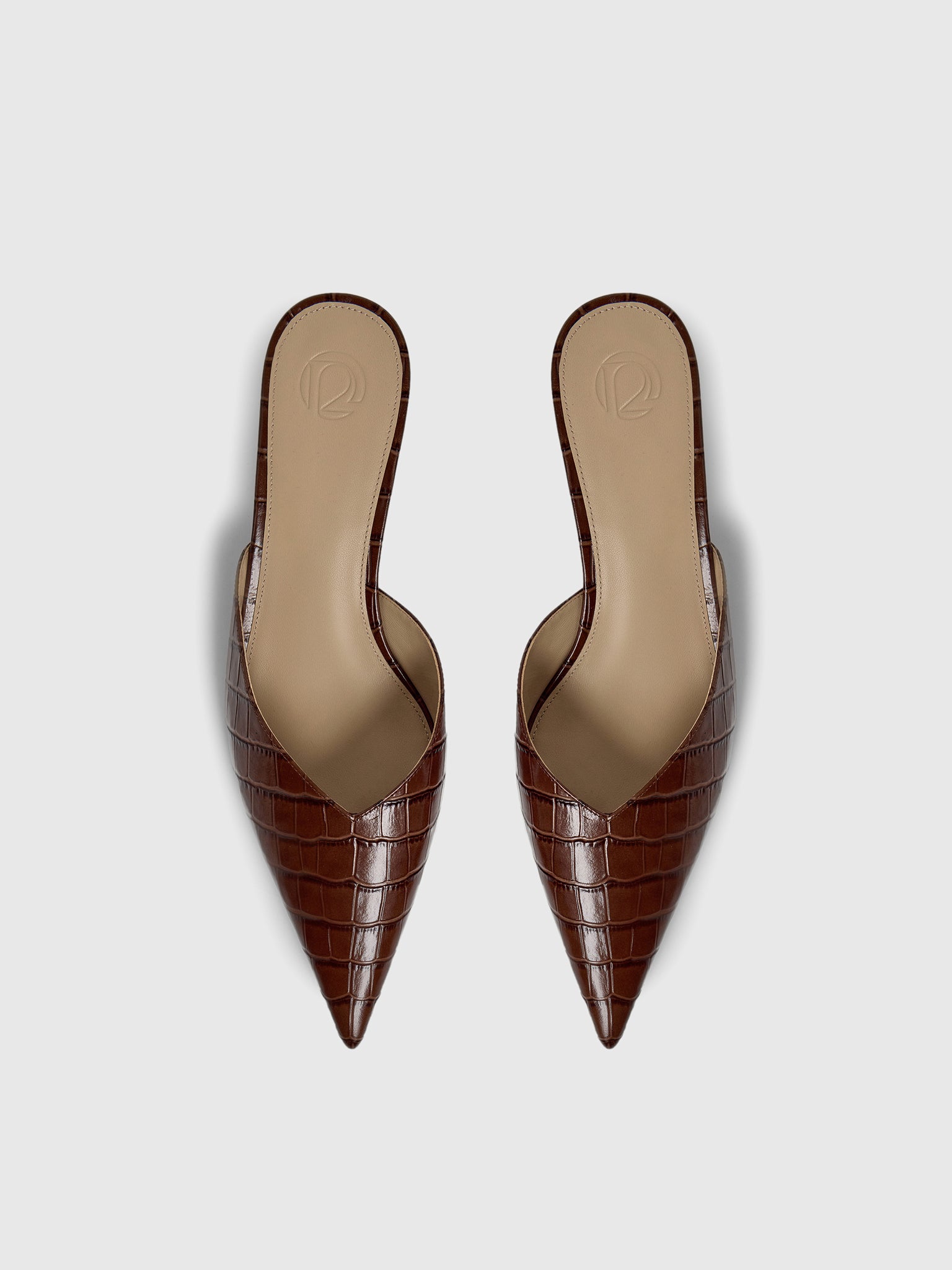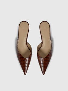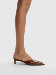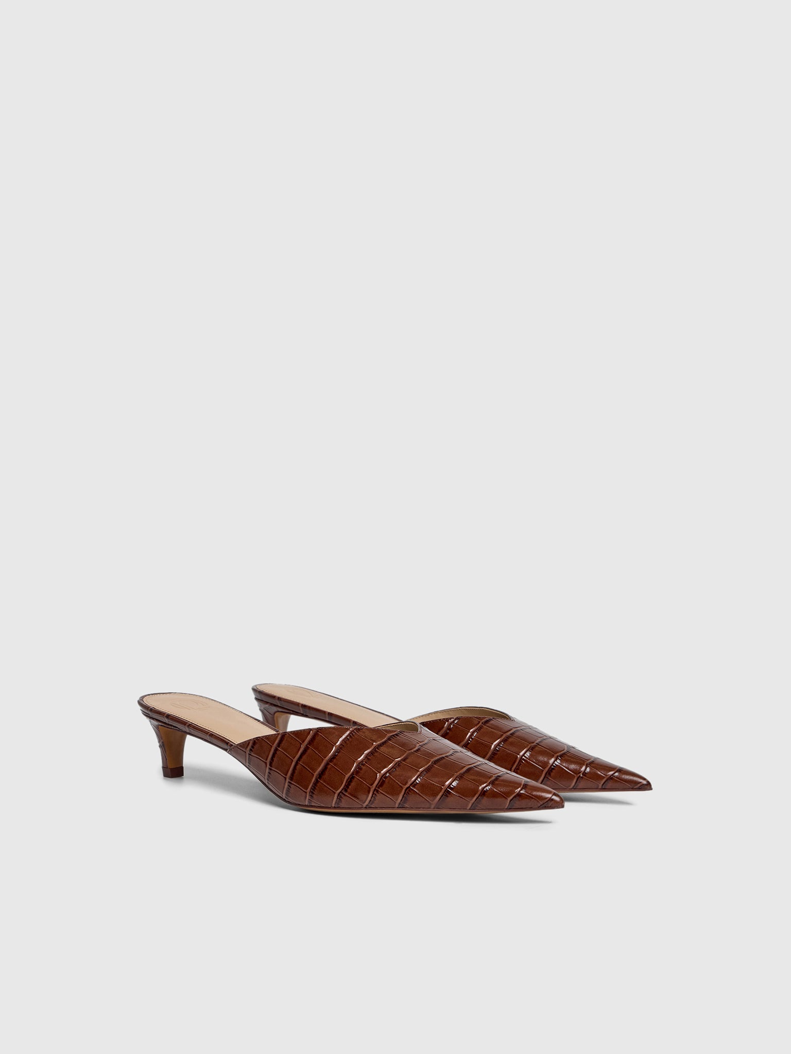A pair with a laid-back attitude, these mules are crafted from crocodile-embossed leather in a sleek V-cut that gently hugs your feet. Lined with supple chevreau leather, they feature durable microfibre insoles and slip-resistant soles. The reinforced toe doesn't crease, while the versatile shade easily transitions from day to night.