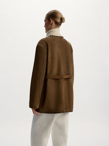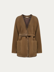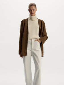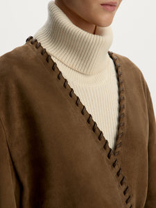 A timeless silhouette, this jacket is crafted from suede chosen for its even, velvety pile and versatile natural shade. The edges are hand-woven with leather for a chic finishing touch. The kimono-inspired design easily pairs with anything from jeans to dresses.
