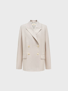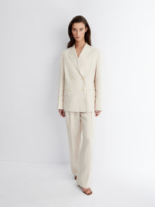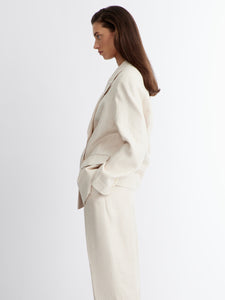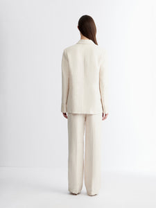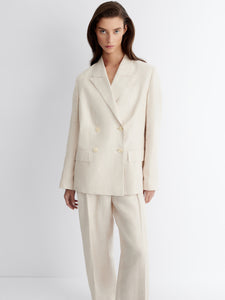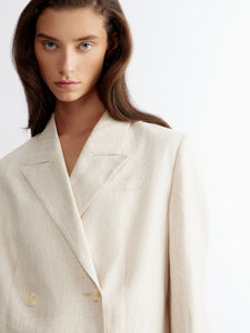 Crafted from herringbone linen with a subtle sheen, this blazer features a masculine silhouette with pronounced shoulders. It's only partially lined with cotton and viscose, so you can wear it in summer heat. Complete the look with the matching trousers or shorts from the capsule.