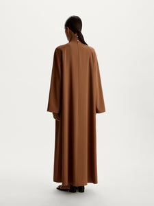 This floor-length dress boasts a relaxed silhouette with wide, slit sleeves for easy movement and a gathered neckline with a structured stand collar. Crafted from dense Ceramica fabric by Riopele, it drapes softly while holding its shape. Finished with side-seam pockets and a back zip.