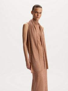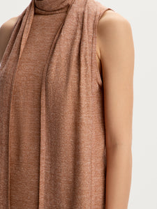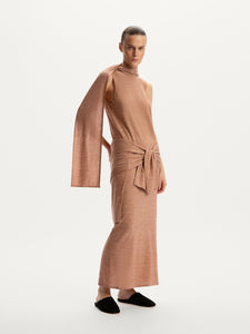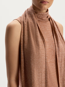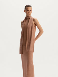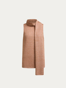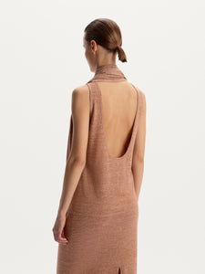 An elegant take on summer knitwear, this top is crafted from a fine blend of merino wool and linen — soft, breathable, and weightless against the skin. The open-back design is complemented by a long, attached scarf that can be wrapped around the neck or left to drape down the back. Complete the look with the matching 12 STOREEZ skirt.