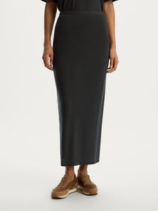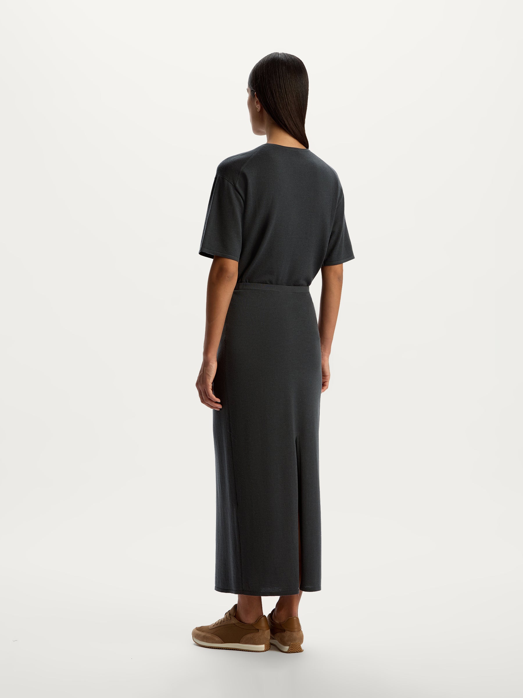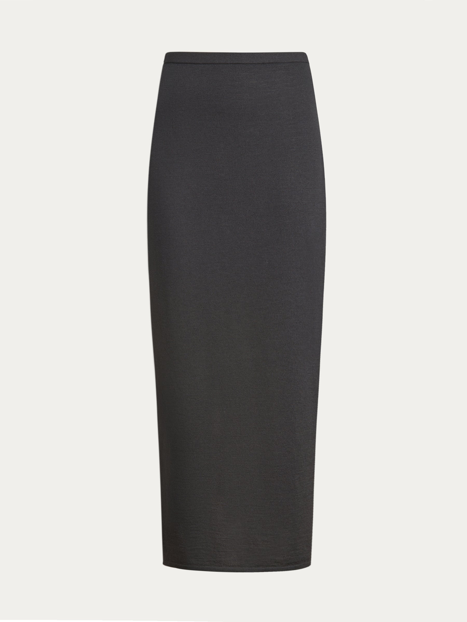 A maxi skirt designed for everyday ease, featuring a slightly lowered rise and a thin elasticated waistband. Finely knitted from a single strand of merino wool, it gently contours your curves and allows your skin to breathe. The back slit ensures easy movement. Pair with seamless underwear for a flawless look.