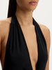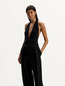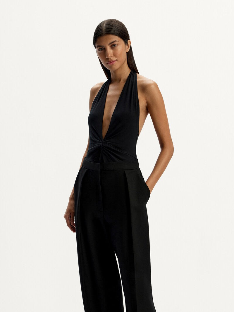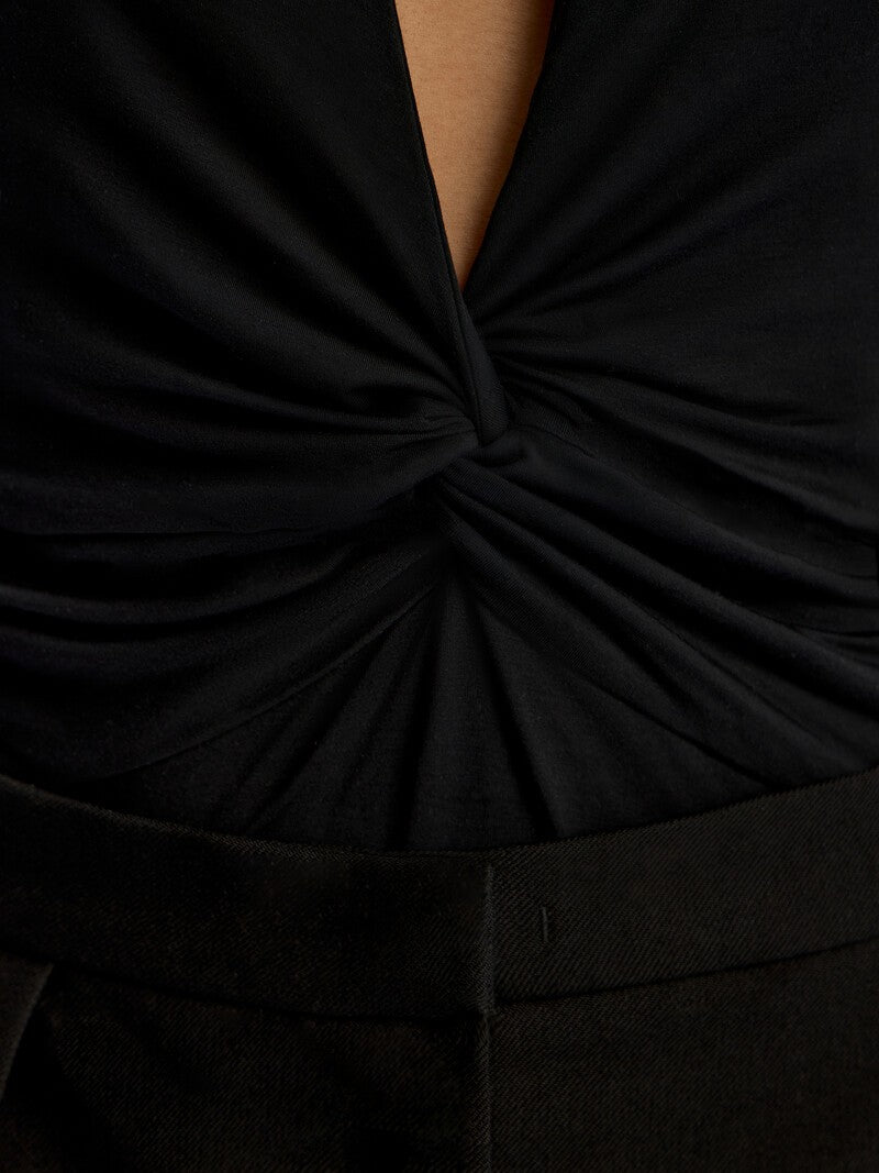A statement piece for evening plans, this bodysuit is crafted from a soft modal-silk blend that gently hugs the body. The deep V-neckline and open back create a bold silhouette, while the twisted detail at the waist adds soft, sculptural folds. Finished with a soft lining and elastic trim for added comfort.
