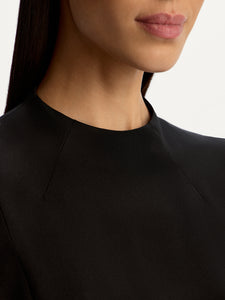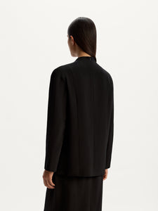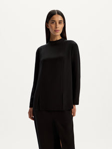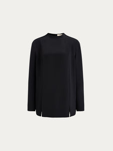 Crafted from Mulberry silk, this blouse features a minimalist panelled design with zips in the sleeves and front slits. Lined with silk chiffon. it showcases no visible seams for a polished look. The versatile collarless silhouette easily transitions from office days to special evenings.