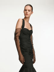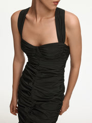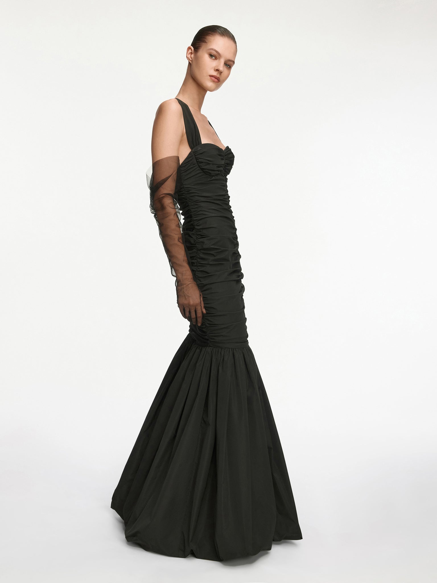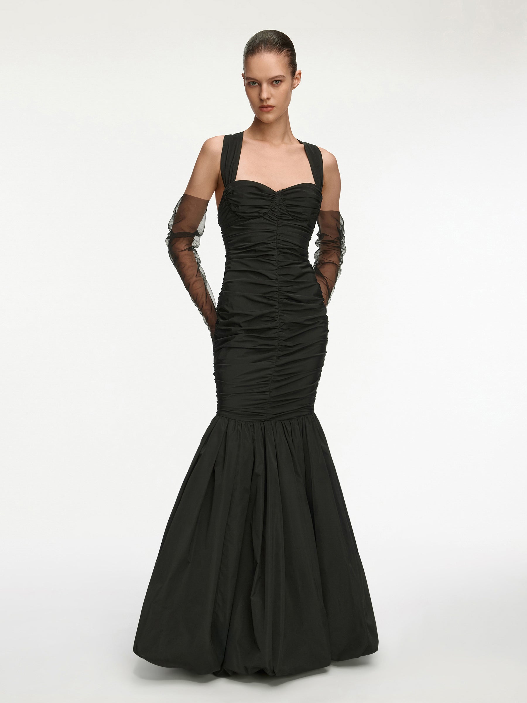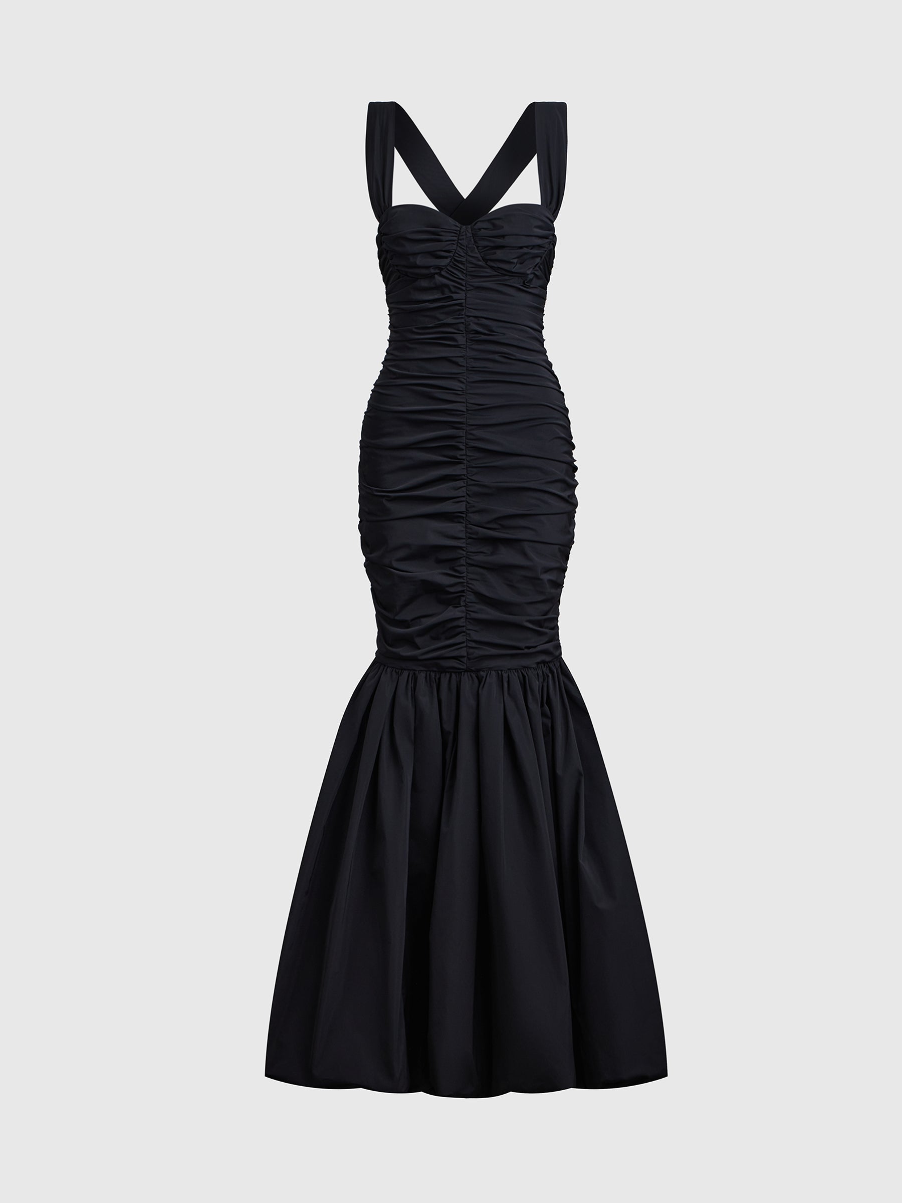 2. Gathered details and a corset-style bodice with underwires shape a slim silhouette