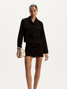 A sleek reinterpretation of a classic button-up silhouette, this cropped jacket features relaxed shoulders for an effortless fit. Crafted from supple suede with a velvety finish, it’s detailed with hand-laced leather along the side and sleeve seams. Fully lined for comfort. Complete the set with the matching 12 STOREEZ skirt.
