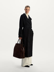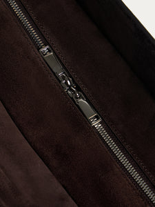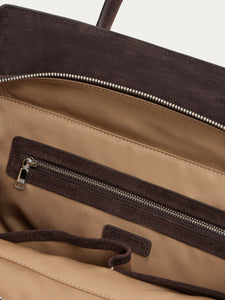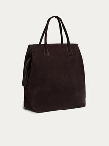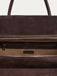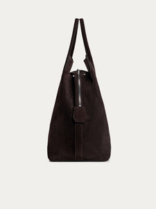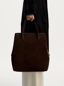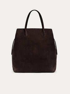 The perfect blend of style and functionality, this bag is crafted from dark brown suede, effortlessly integrating into your on-the-go ensembles. It features a defined shape with structured upper edges and a single compartment with interior pockets. Metal feet protect the base from scratches, and the suede handles are reinforced with an interior cord for added durability.
