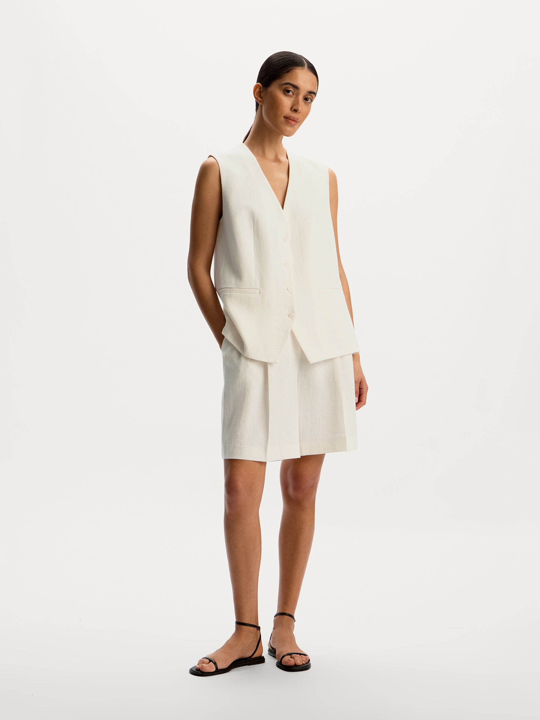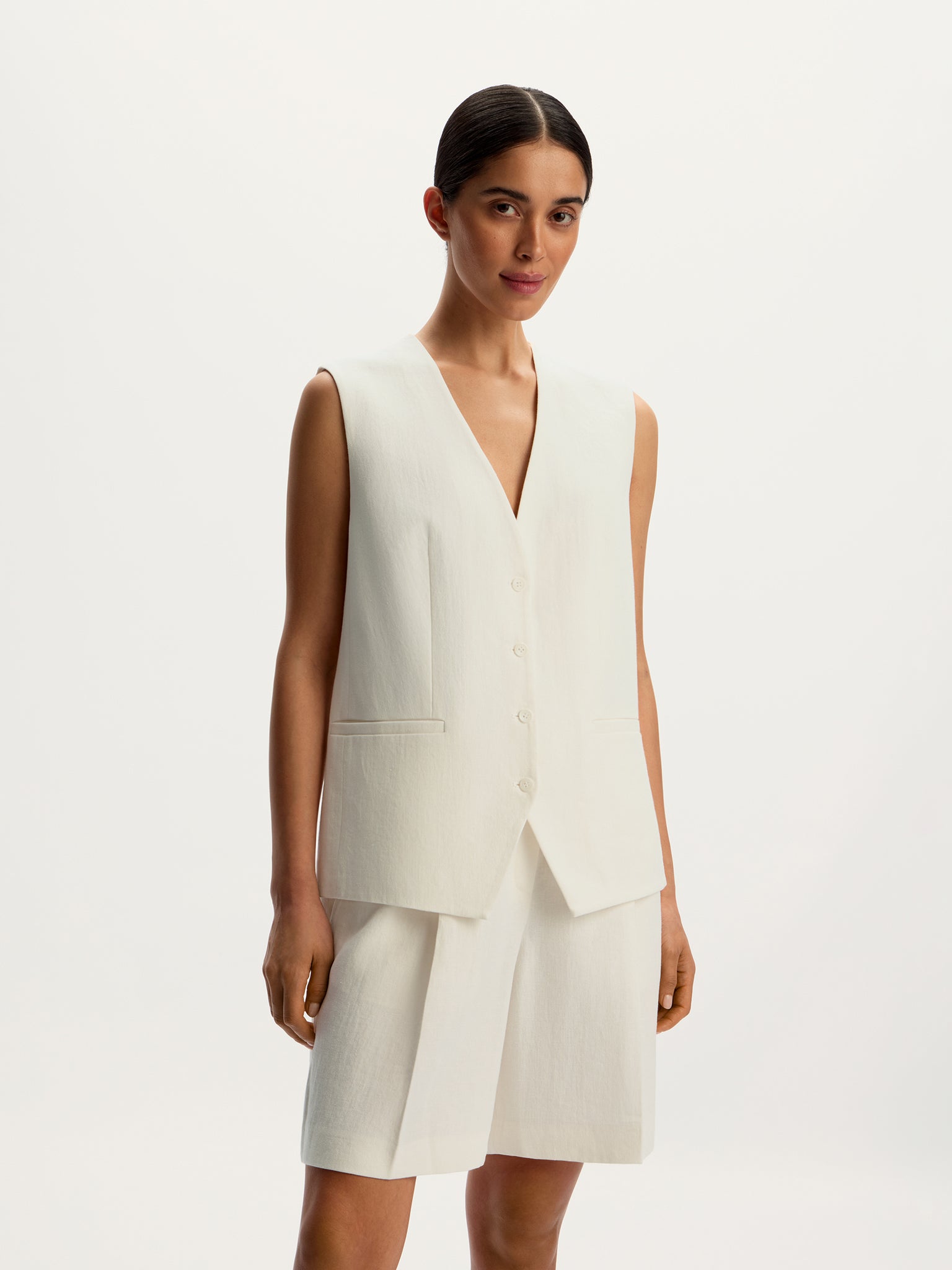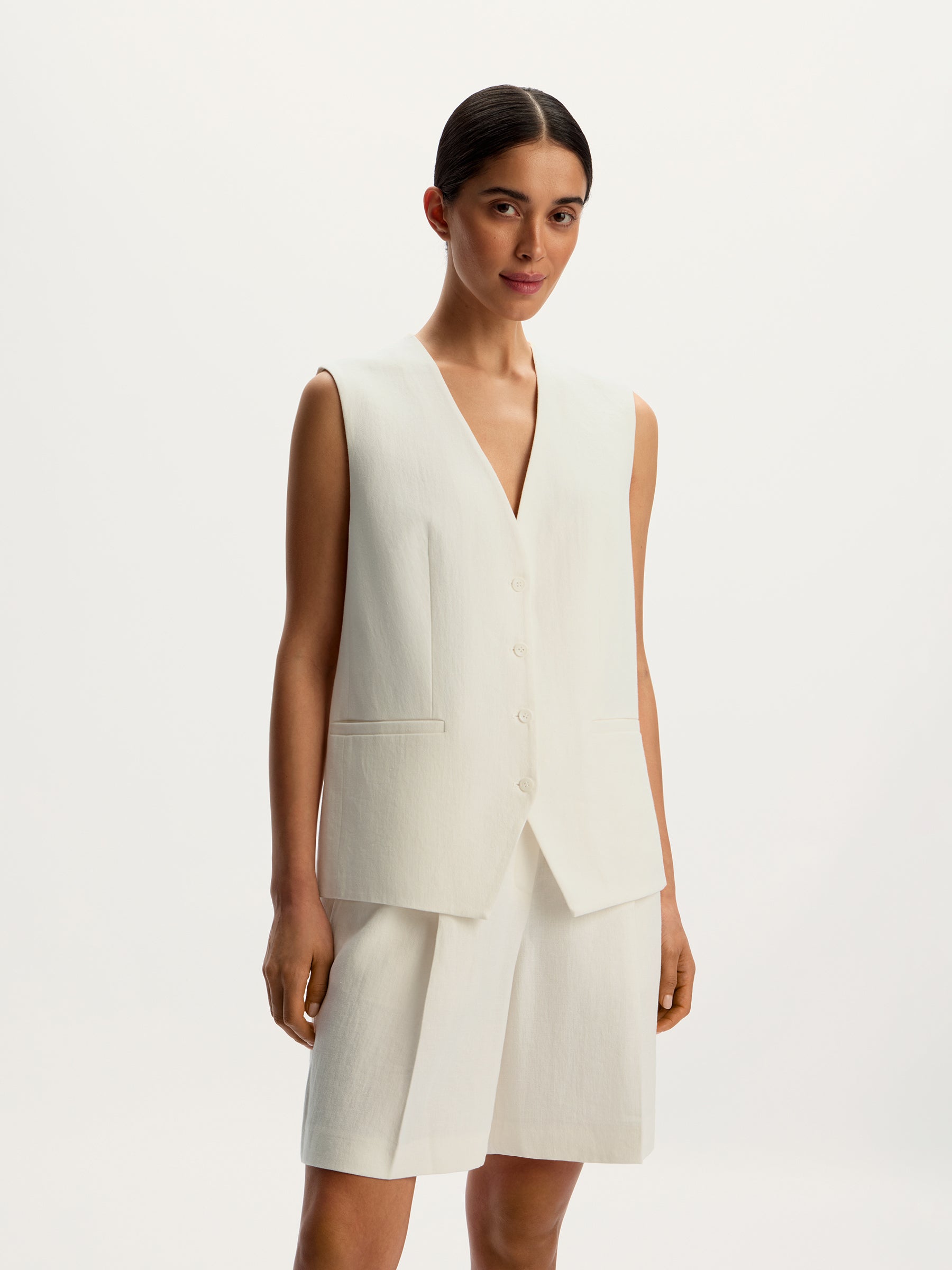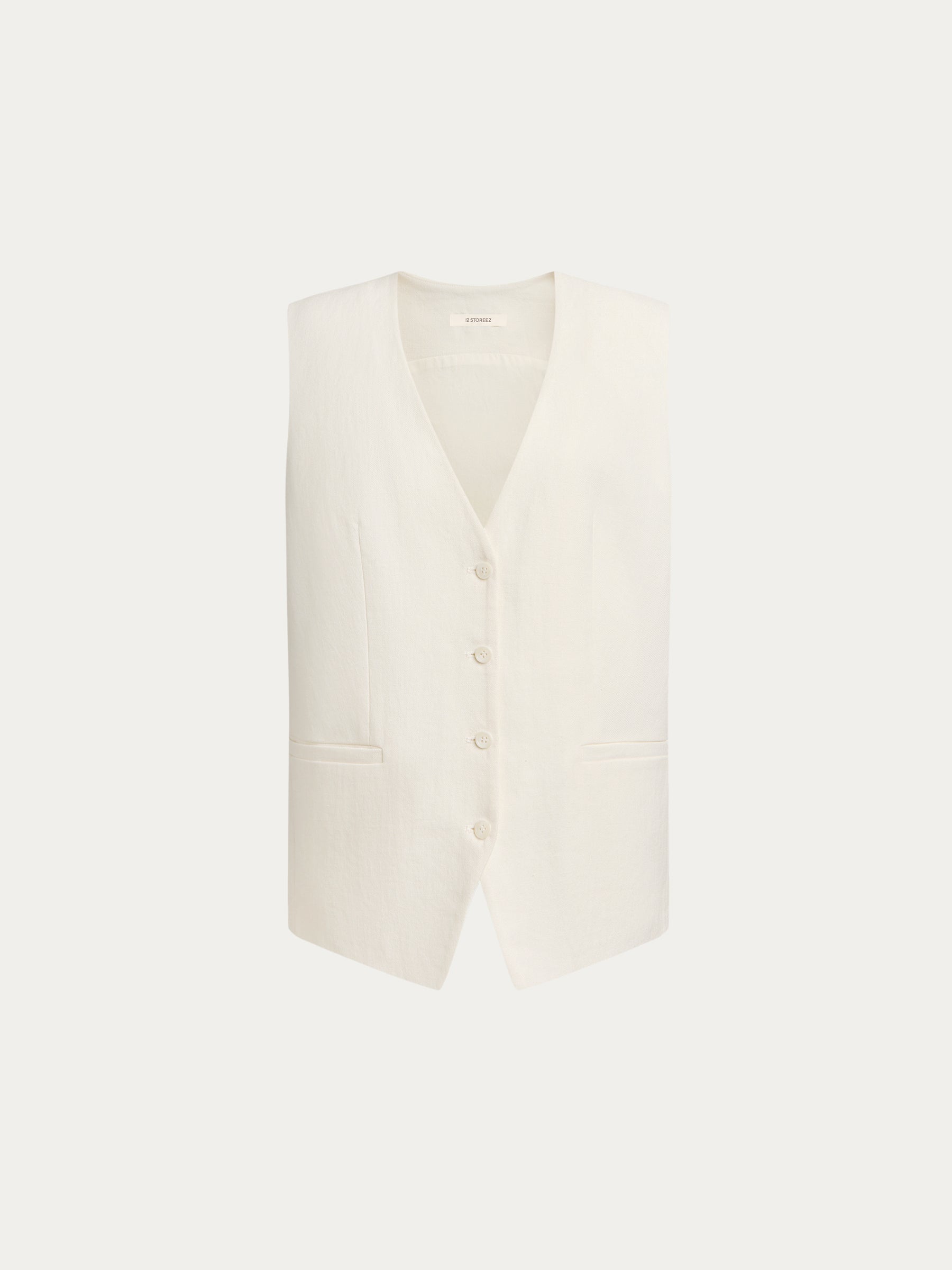 A structured linen-blend vest with a clean, slightly elongated silhouette. Easy to style on its own or layered over a T-shirt, it’s made from fabric by our Portuguese partner that combines the lightness of linen with the smooth feel of synthetic fibres — helping it hold its shape and wrinkle less, so you always look put-together.