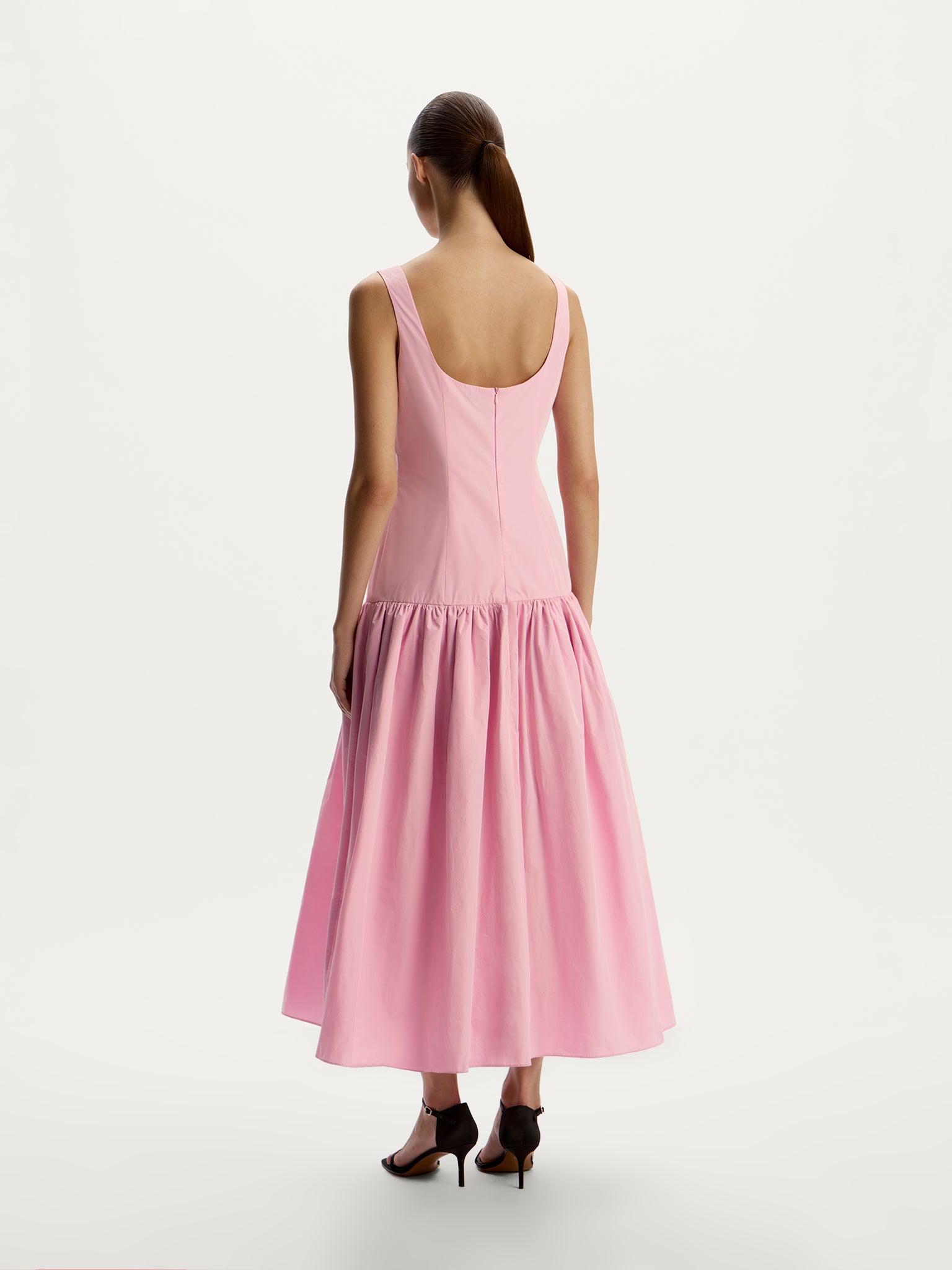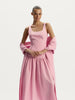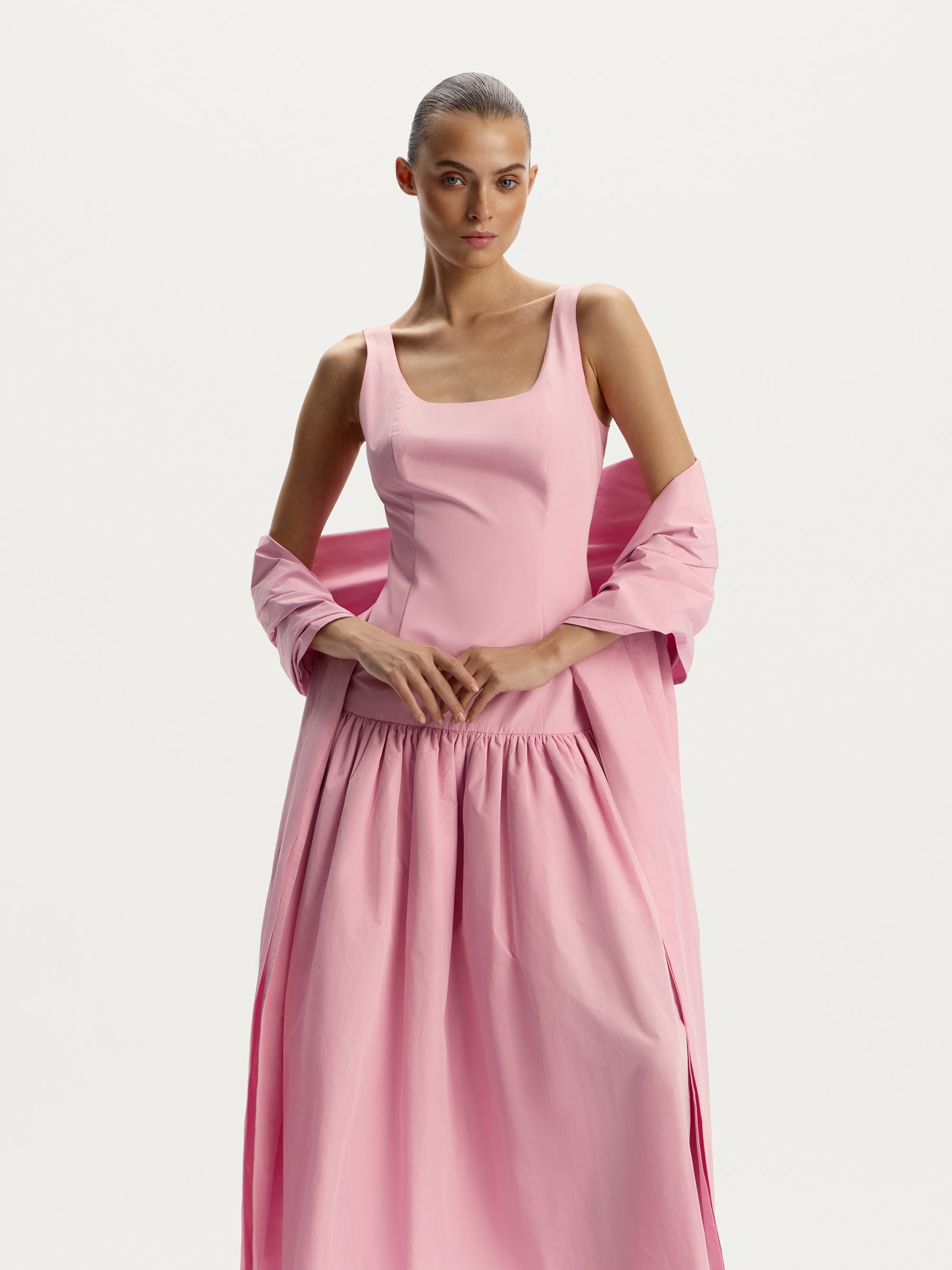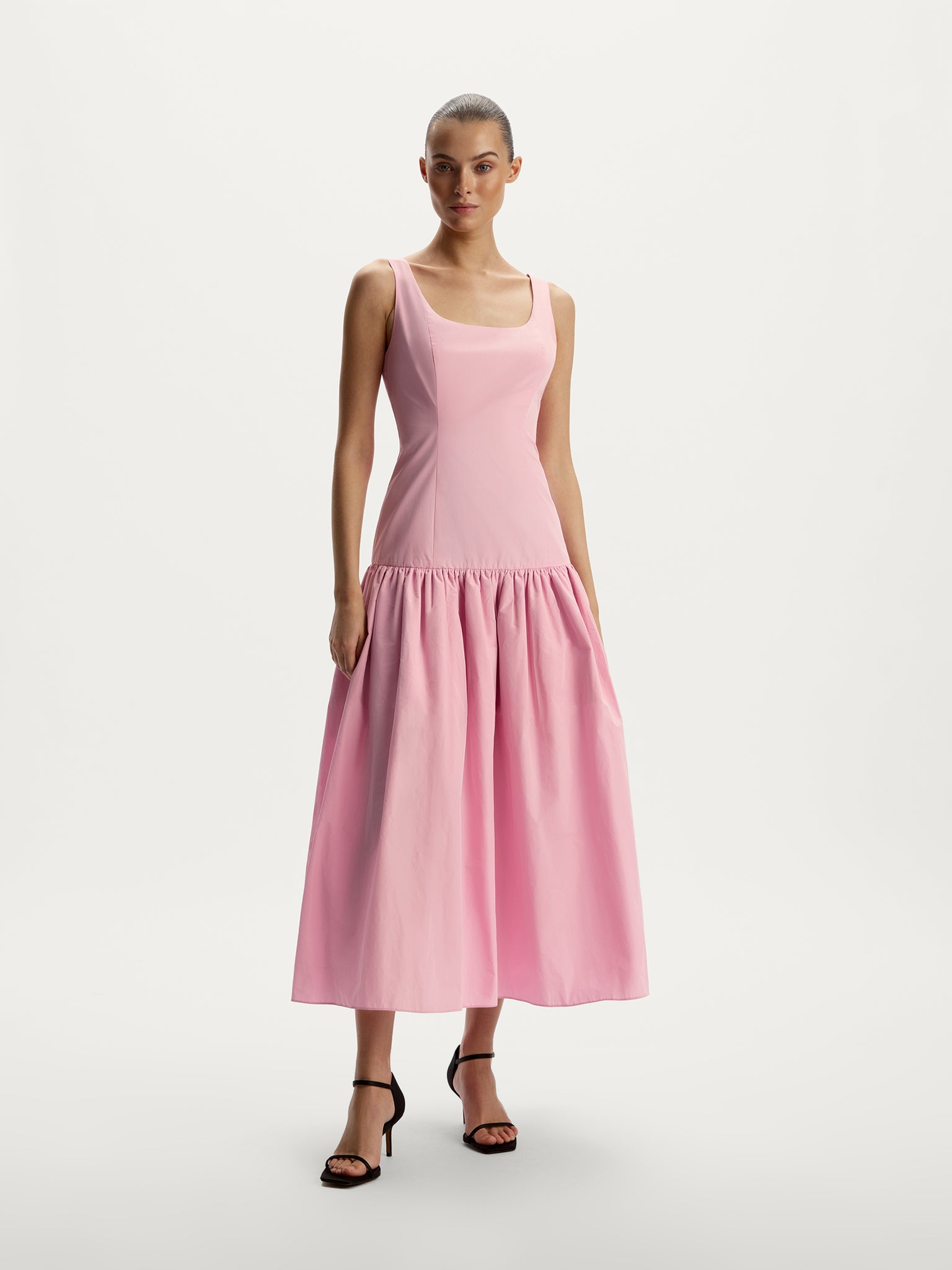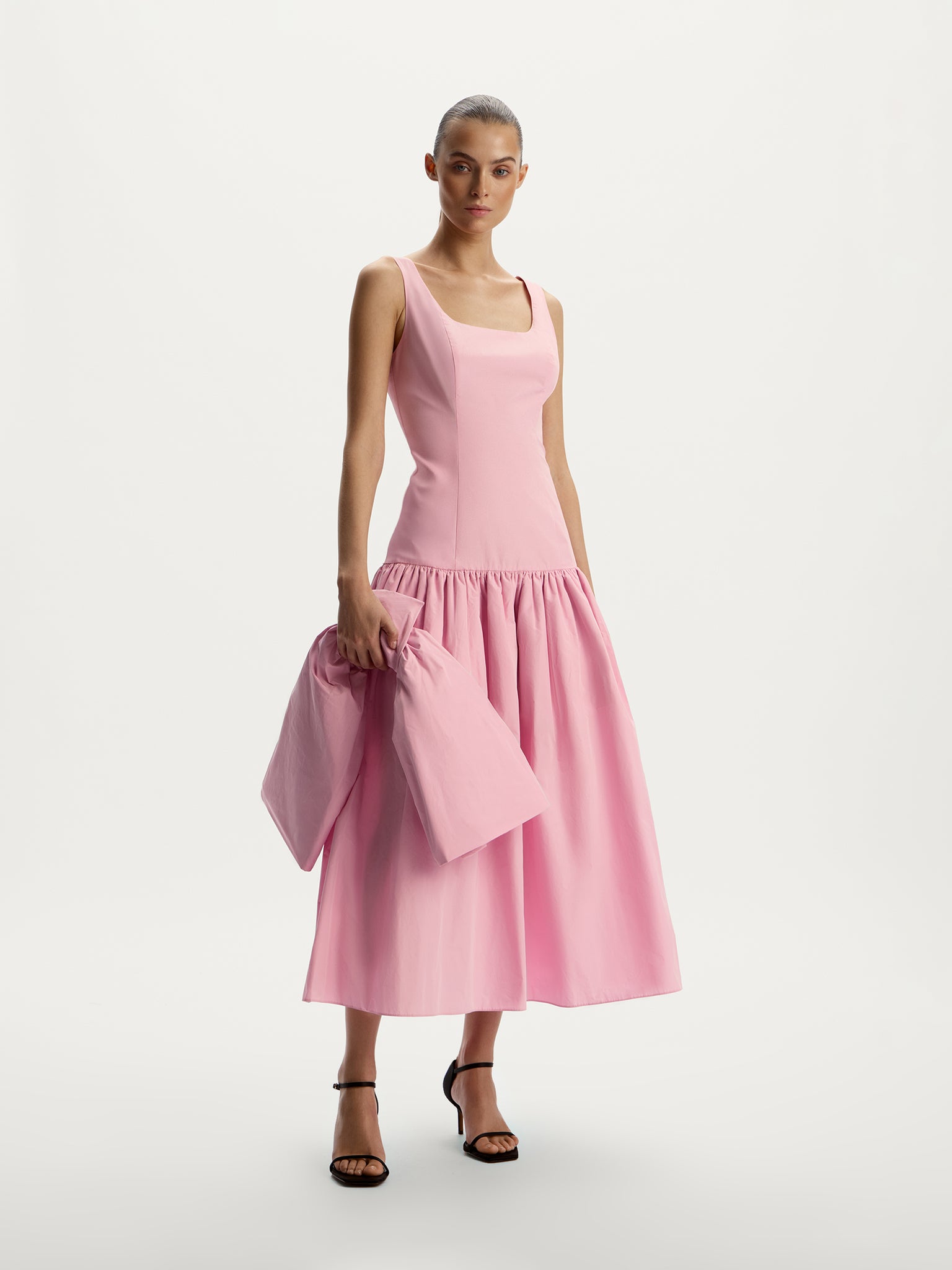 Drawing inspiration from ballerina aesthetics, this dress is designed with a lowered waist extending into a voluminous midi skirt. Taffeta shimmers in the light, making sure that all eyes at the party are on you.