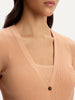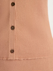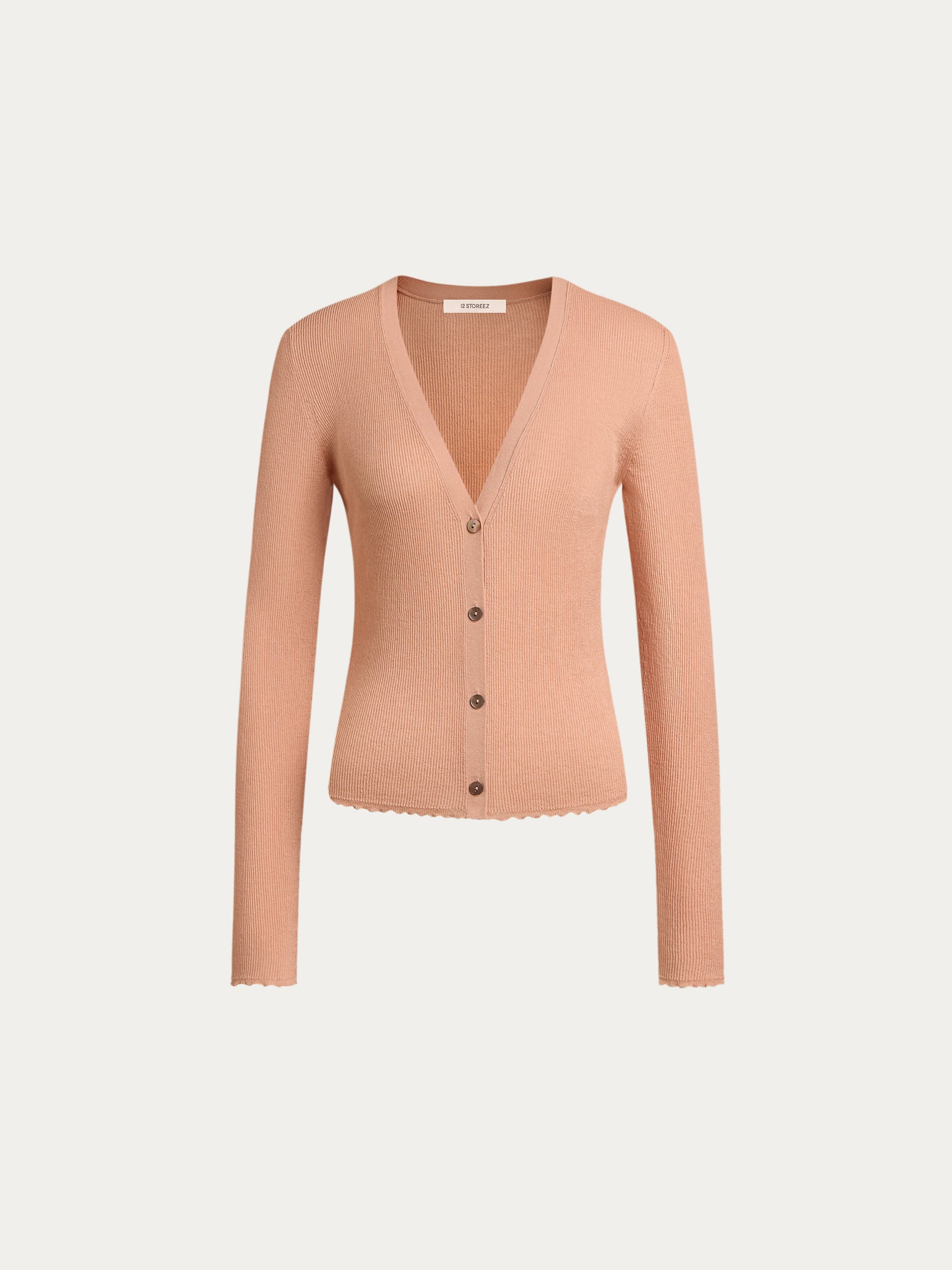 A delicate layering piece, this cardigan is knitted from silky viscose in a fine ribbed texture that feels smooth and cool against the skin. Designed with a deep V-neckline and slim sleeves, it fastens with mother-of-pearl buttons for a refined touch. Complete the set with the matching 12 STOREEZ skirt and tank top.