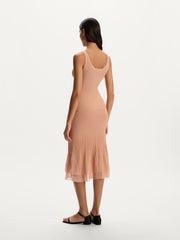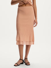 Light and fluid, this midi skirt is knitted from silky viscose in a semi-sheer double-layered design. The ribbed knit subtly flares towards the hem, while the soft elasticated waistband ensures a comfortable fit. Complete the set with the matching 12 STOREEZ tank top and cardigan.
