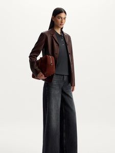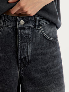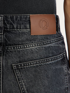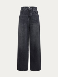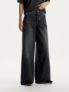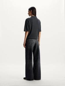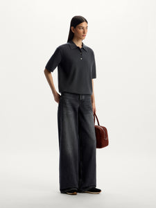 Sitting low on the waist, these jeans feature a long wide-leg silhouette, flared from the hips down. They are crafted from premium 12-oz denim by an Italian manufacturer, Candiani, featuring a dark grey shade that easily integrates into any look.