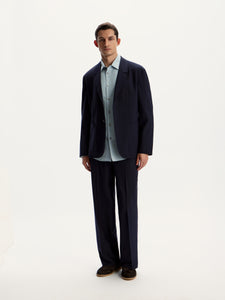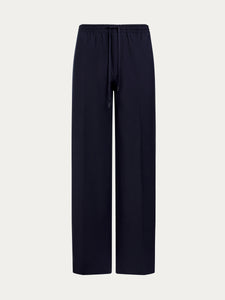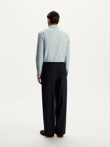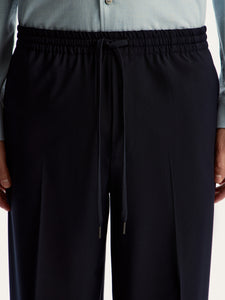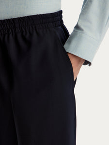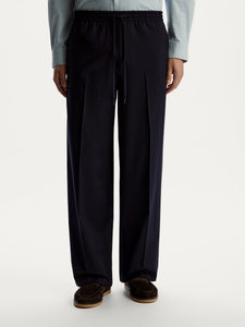 A relaxed yet polished staple, these trousers are crafted from a lightweight wool blend that feels soft and fluid. Designed with an elasticated waistband, they feature a cotton drawstring with metal tips and a functional fly. Pressed creases add a tailored finish, making them suitable for formal settings. Complete the set with the matching 12 STOREEZ blazer.