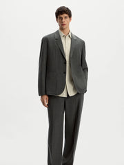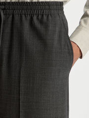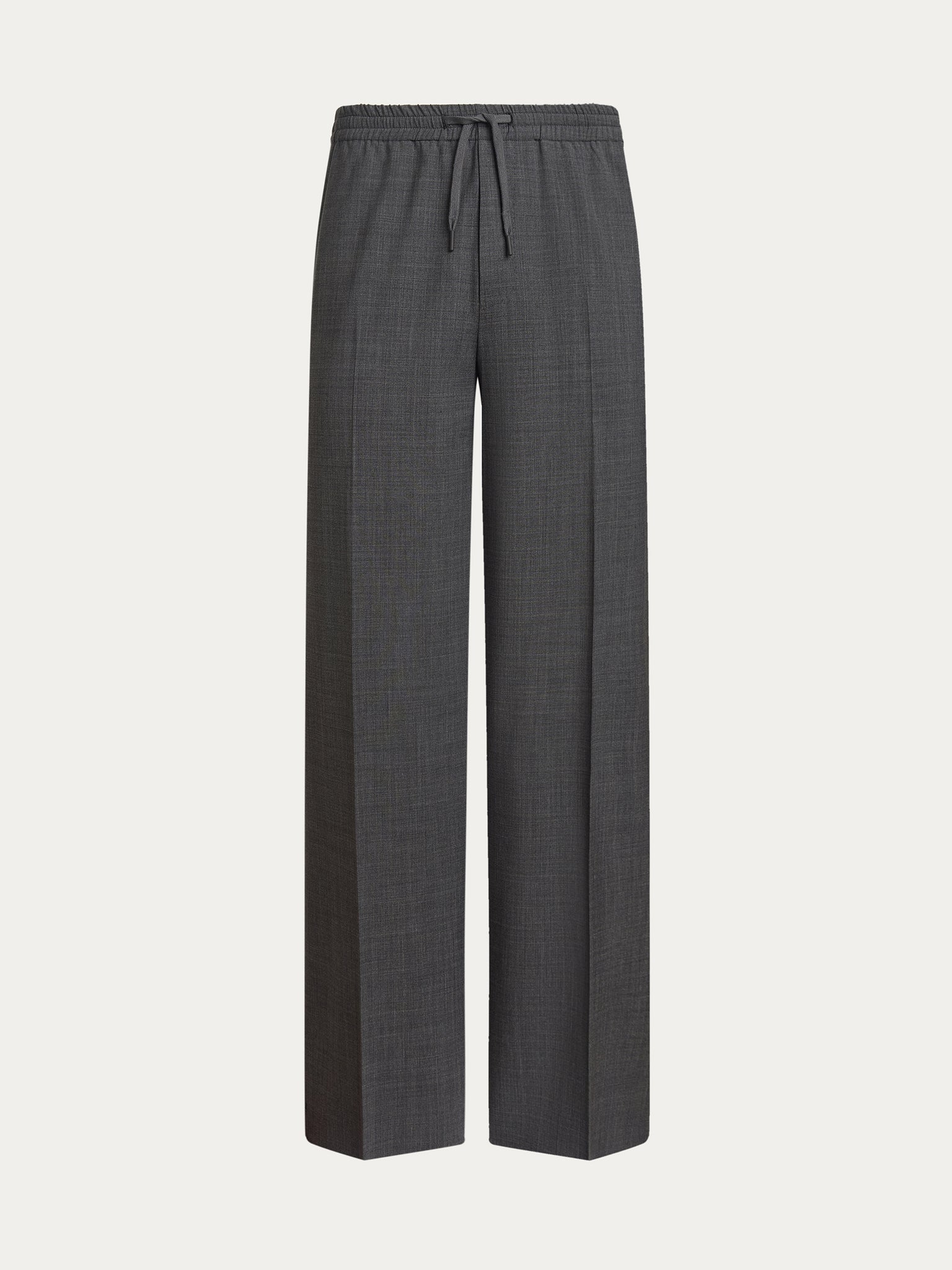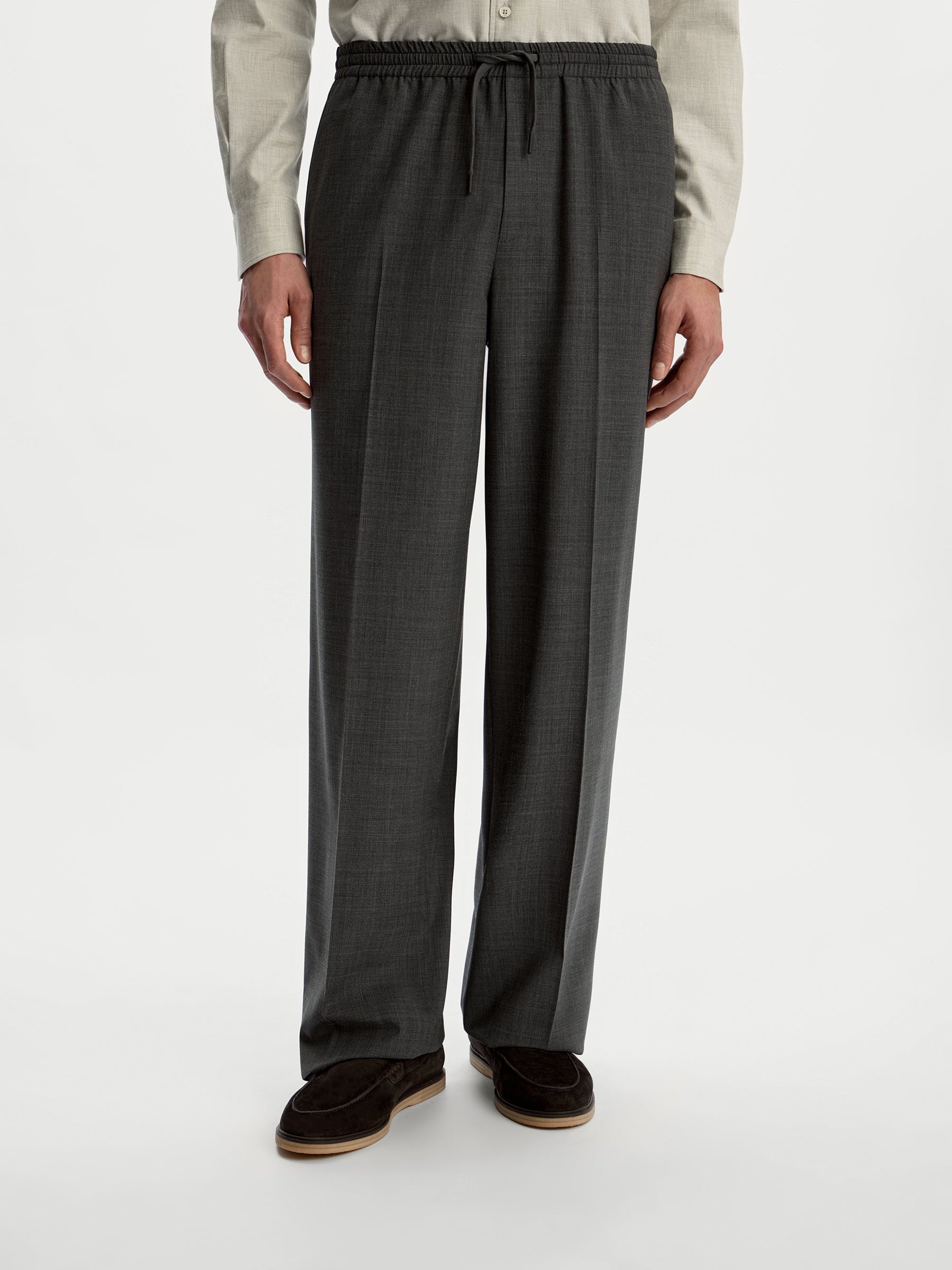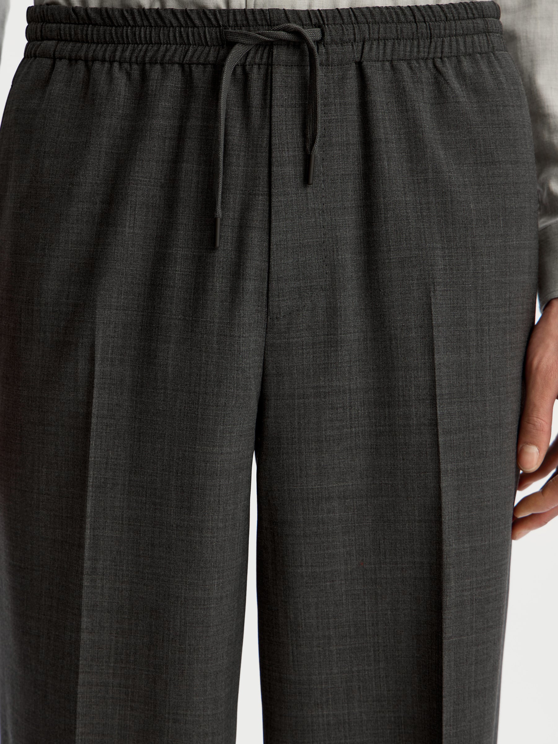 A relaxed yet polished staple, these trousers are crafted from a lightweight wool blend that feels soft and fluid. Designed with an elasticated waistband, they feature a cotton drawstring with metal tips and a functional fly. Pressed creases add a tailored finish, making them suitable for formal settings. Complete the set with the matching 12 STOREEZ blazer.