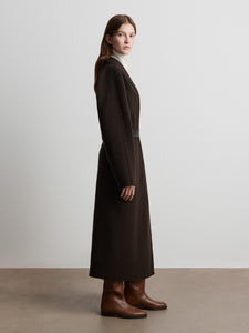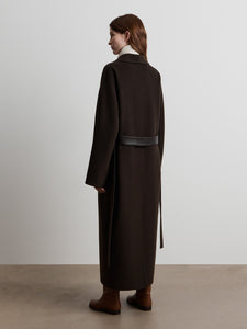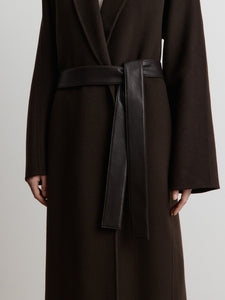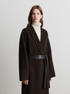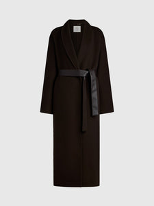 Made from cosy merino and cashmere, this coat features a subtly relaxed fit with roomy kimono sleeves, leaving plenty of space for layering chunky knits underneath. With its double-face design, you’ll be tempted to wear it unbelted to showcase the coat’s interior. Finished with leather details on the belt and pockets for an elegant touch.
