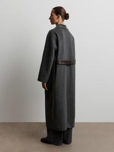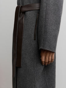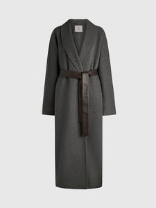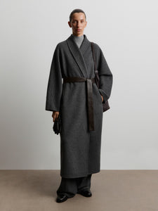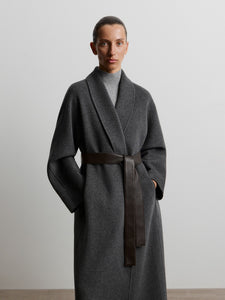Made from cosy merino and cashmere, this coat features a subtly relaxed fit with roomy kimono sleeves, leaving plenty of space for layering chunky knits underneath. With its double-face design, you’ll be tempted to wear it unbelted to showcase the coat’s interior. Finished with leather details on the belt and pockets for an elegant touch.