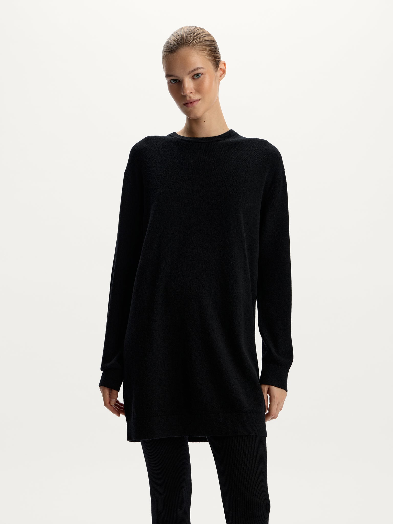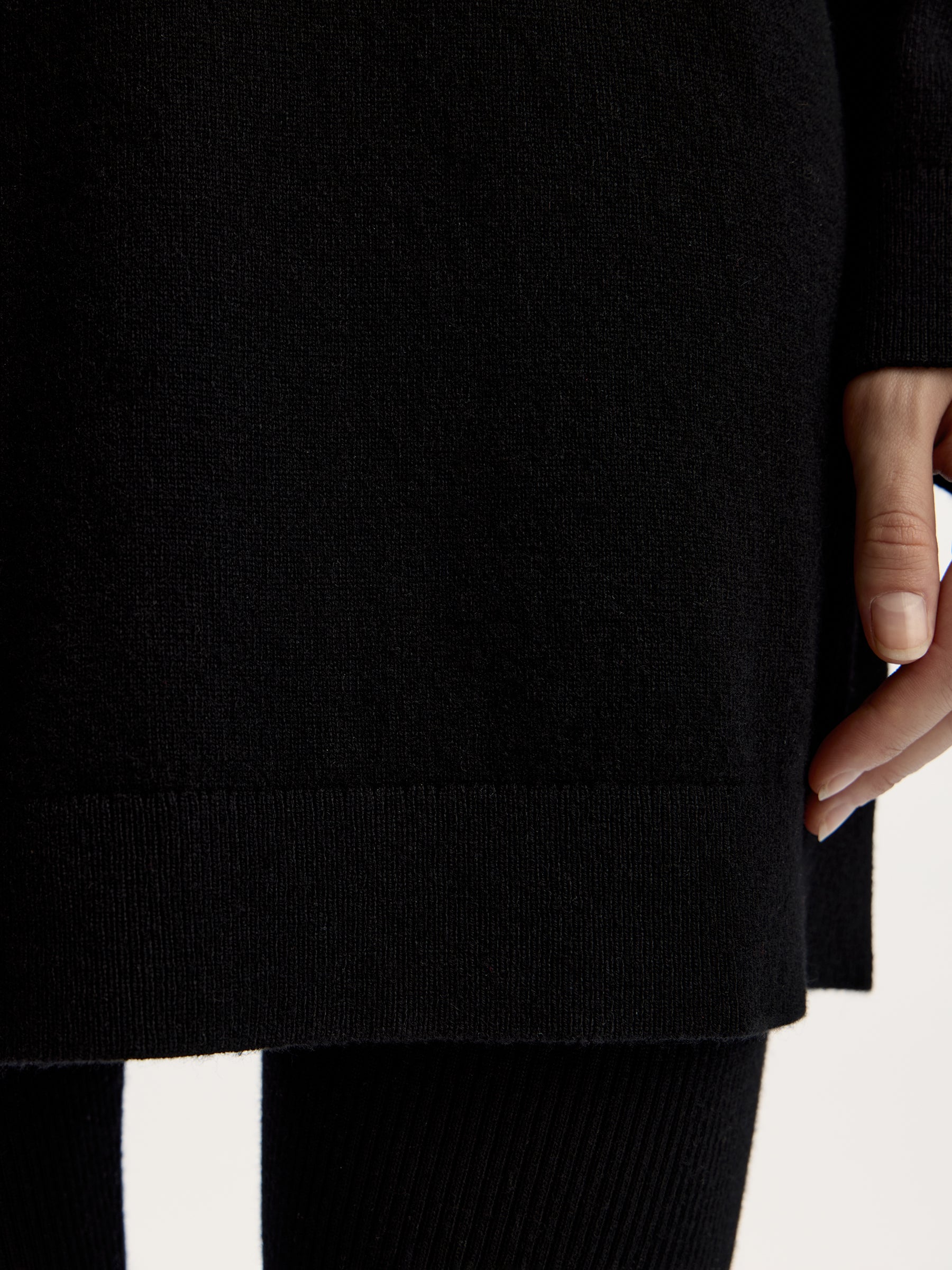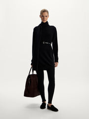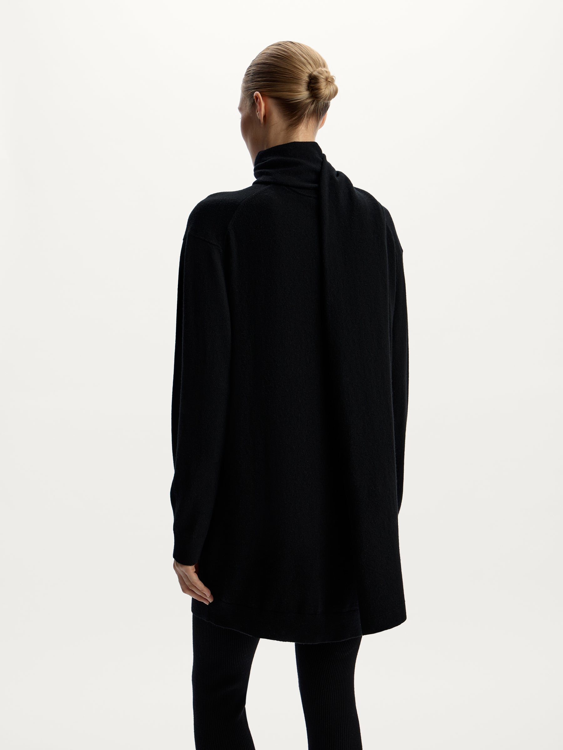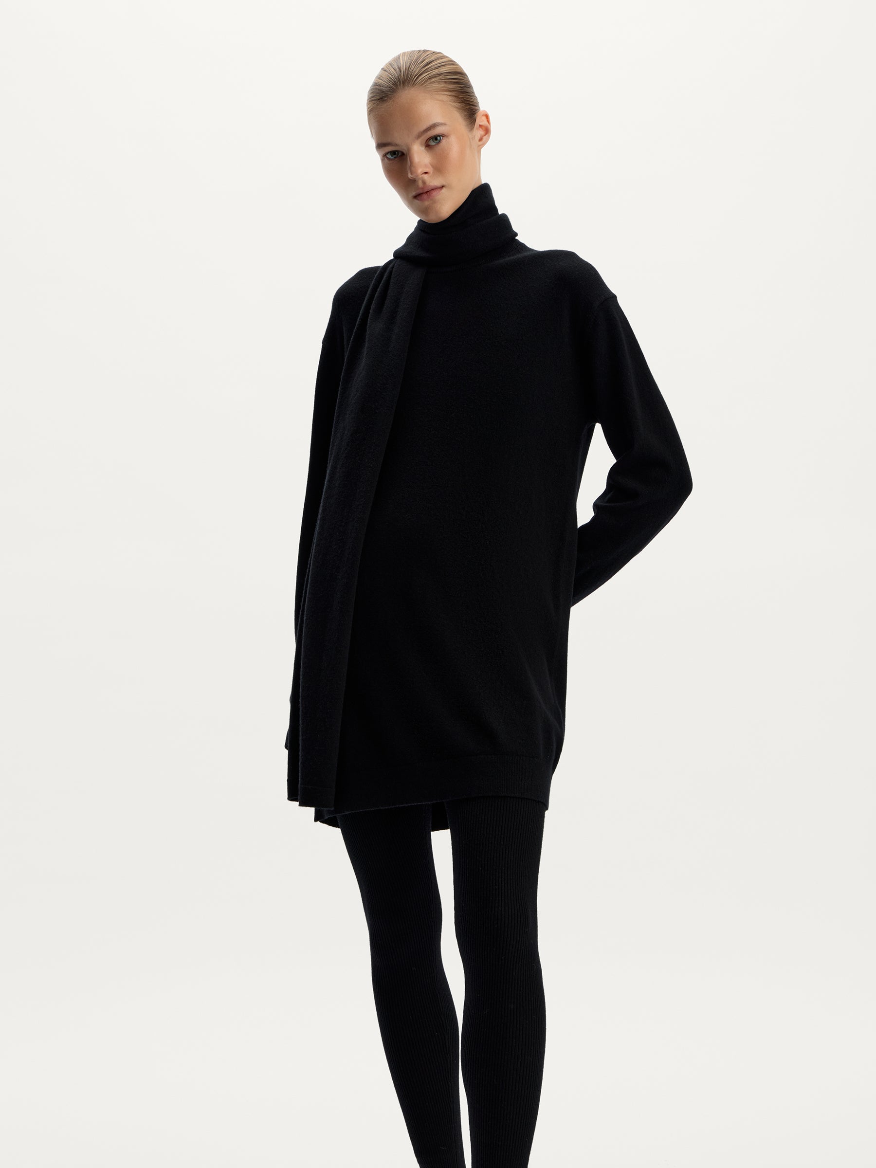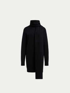 Crafted from a tactile blend of merino wool and cashmere, this dress features a roomy silhouette reminiscent of classic men's jumpers. The long, tonal scarf, attached with two subtle buttons, perfectly complements the look.