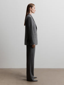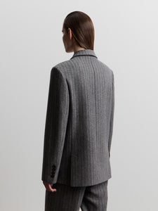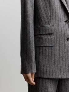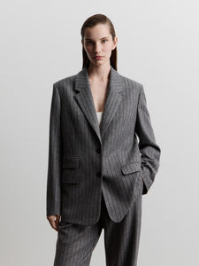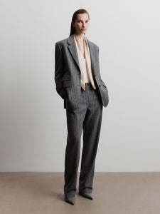 A new blazer in the collection, relaxed and inspired by menswear for an easy, cosy feel. Crafted from brushed pinstripe fabric in wool, viscose, and silk, it’s finished with a breathable lining for added warmth. Complete the set with the matching 12 STOREEZ trousers or skirt.